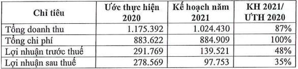 Chỉ tiêu tổng lợi nhuận trước thuế năm 2021 là 202 tỷ đồng. Tỷ lệ chi trả cổ tức là 12%, hình thức chi trả sẽ do ĐHĐCĐ thường niên năm 2021 quyết định.