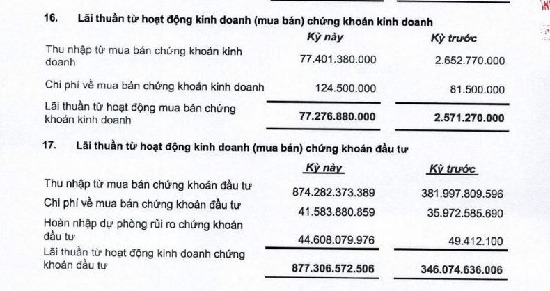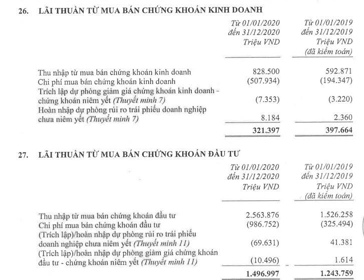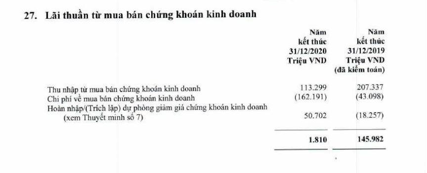 Tuy nhiên, hoạt động mua bán chứng khoán đầu tư là điểm sáng duy nhất trong quý này khi báo lãi tăng 43% so với cùng kỳ, đạt 252 tỷ đồng. Lũy kế cả năm 2020, hoạt động mua bán chứng khoán đầu tư tăng vọt 169%, lên mức gần 835 tỷ đồng.