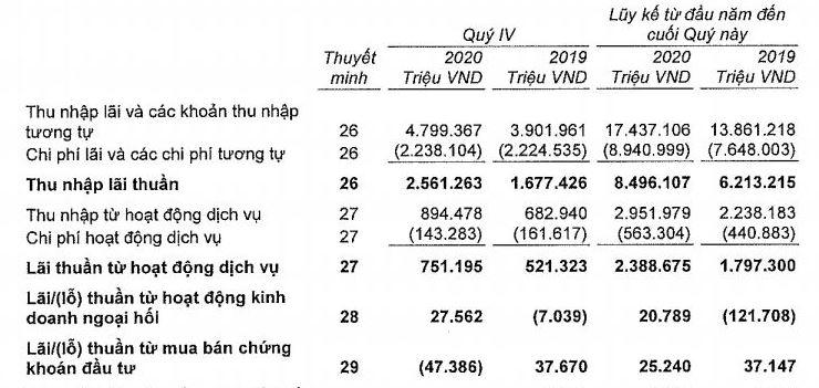 Tương tự, trong quý 4/2020, hầu hết các hoạt động kinh doanh của VietBank đều không mấy khả quan. Trong đó, hoạt động chính sụt giảm đến 72% so với cùng kỳ, chỉ còn gần 86 tỷ đồng thu nhập lãi thuần.