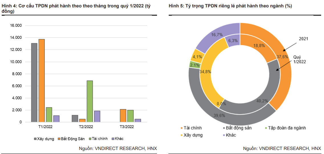 Đồng quan điểm với SSI Research, VNDirect cũng cho biết khối lượng phát hành TPDN riêng lẻ có xu hướng giảm dần qua các tháng trong Q1/22, với giá trị tháng 1 là 27.115 tỷ đồng, tháng 2 là 8.193 tỷ đồng, tháng 3 là 4.170 tỷ đồng. Điều này trái ngược với diễn biến trong Q1/21 khi giá trị phát hành TPDN riêng lẻ có xu hướng tăng dần qua các tháng. Lý giải về nguyên nhân, VNDirect nhận định nguyên nhân chủ yếu đến từ việc thông tư 16/2021/TT-NHNN có hiệu lực kể từ 15/01/2022. Thông tư 16/2021/TT-NHNN áp dụng các quy định chặt chẽ hơn dành cho các Tổ chức tín dụng (TCTD) trong việc mua bán TPDN, cũng như nâng cao chất lượng của doanh nghiệp phát hành.