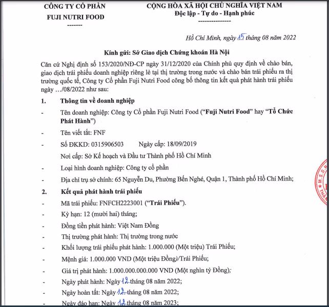 Gần hết tháng 8, nhưng nhóm trái phiếu bất động sản mới có duy nhất một doanh nghiệp phát hành trái phiếu là CTCP Fuji Nutri Food với giá trị phát hành 1.000 tỷ đồng, kỳ hạn 1 năm.