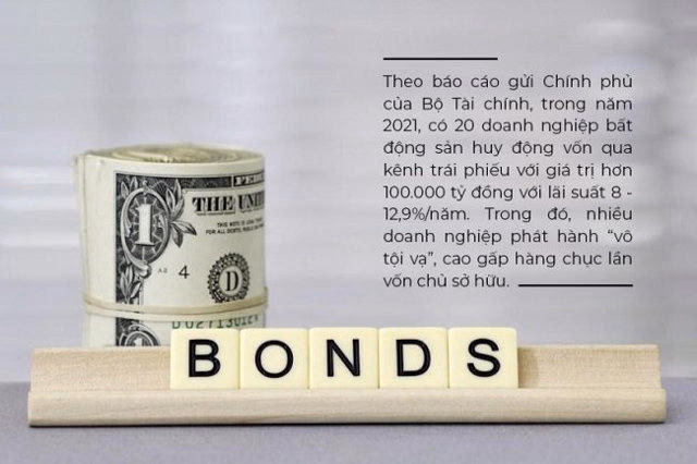 Theo báo cáo gửi Chính phủ của Bộ Tài chính, trong năm 2021, có 20 doanh nghiệp bất động sản huy động vốn qua kênh trái phiếu với giá trị hơn 100.000 tỷ đồng với lãi suất 8 – 12,9%/năm. Trong đó, nhiều doanh nghiệp phát hành “vô tội vạ”, cao gấp hàng chục lần vốn chủ sở hữu.