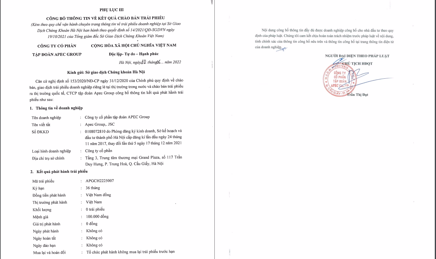 Trước đó, vào giữa tháng 12/2021, Apec Group đã phát hành thành công hơn 43,6 tỷ đồng trái phiếu riêng lẻ với kỳ hạn 5 năm, đáo hạn vào 9/12/2026. Đây là loại trái phiếu không chuyển đổi và không có tài sản đảm bảo. Lãi suất được tính cố định 13%/năm và cứ ba tháng trả lãi một lần.