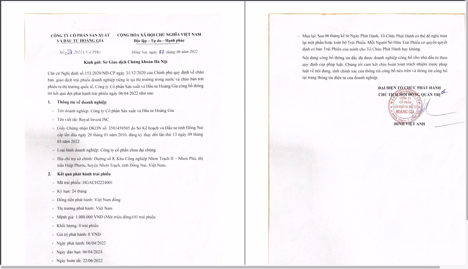 Một doanh nghiệp khác cũng vừa công bố thông tin huy động vốn qua trái phiếu bất thành là CTCP Sản Xuất và đầu tư Hoàng Gia, doanh nghiệp phát hành không thành công mã trái phiếu HGACH2224001 kỳ hạn 24 tháng, mệnh giá 1 triệu đồng/trái phiếu. Đây cũng là lần đầu tiên doanh nghiệp công bố thông tin về kết quả phát hành trái phiếu trên Sở giao dịch Chứng khoán Hà Nội (HNX).