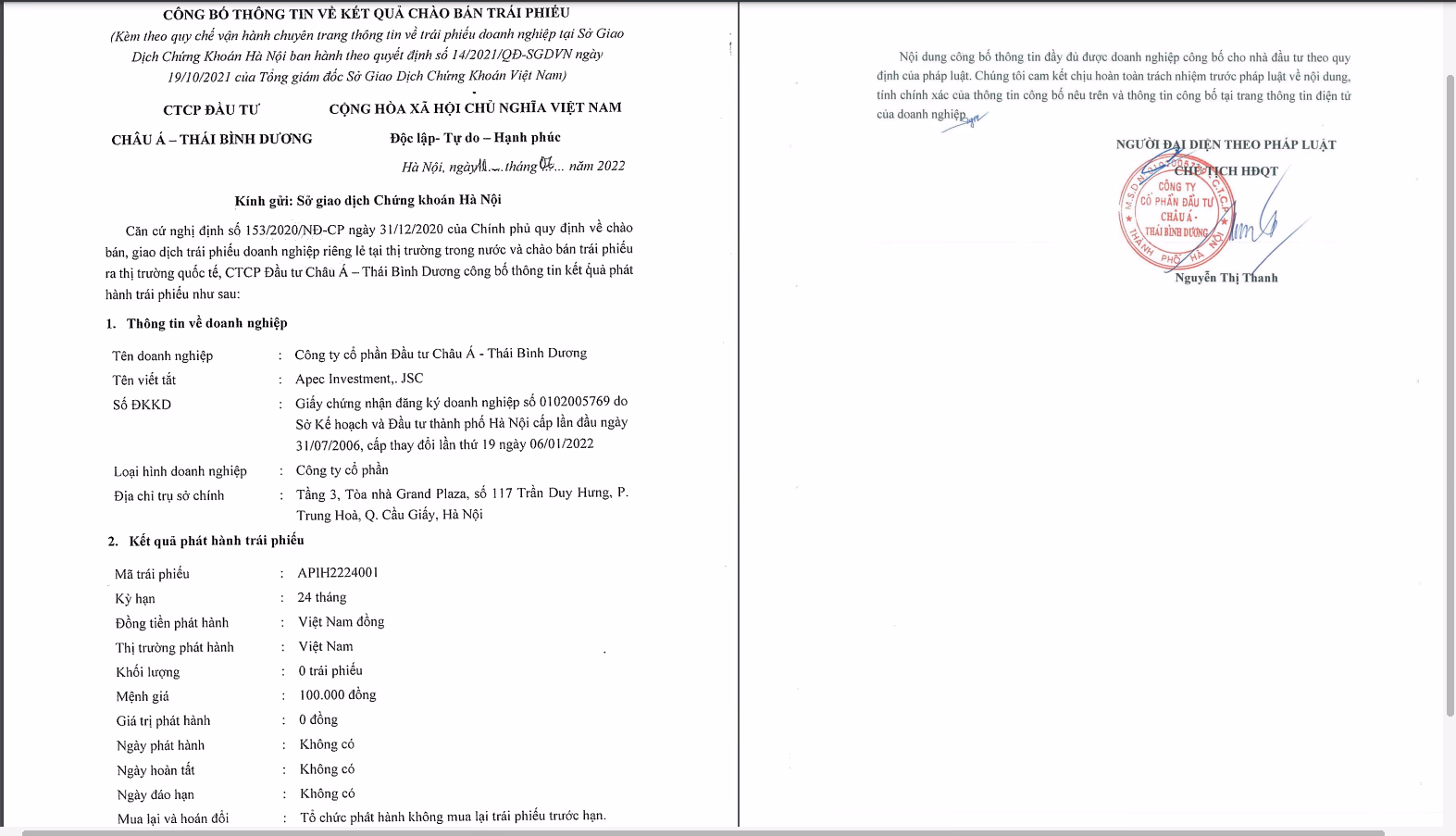 Một doanh nghiệp khác liên quan đến “hệ sinh thái” của Apec Group là CTCP Đầu tư Châu Á – Thái Bình Dương (Mã CK: API) cũng vừa công bố phát hành không thành công mã trái phiếu là APIH2224001 có kỳ hạn 24 tháng với mệnh giá 100.000 đồng/trái phiếu.