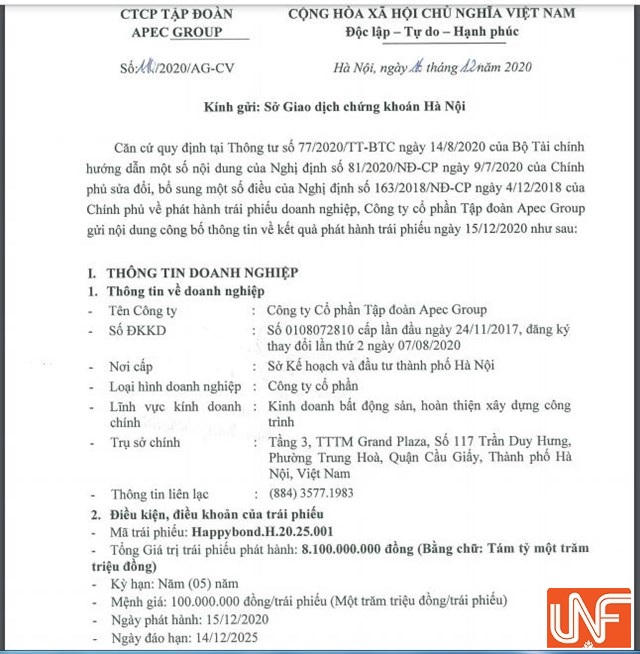 Công ty cổ phần Tập đoàn Apec Group vừa công bố thông tin về kết quả phát hành trái phiếu riêng lẻ gói trái phiếu Happybond.H.20.25.001 với tổng giá trị trái phiếu phát hành đạt 8,1 tỷ đồng.