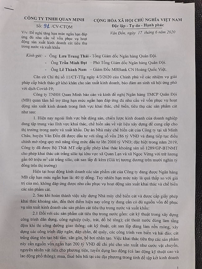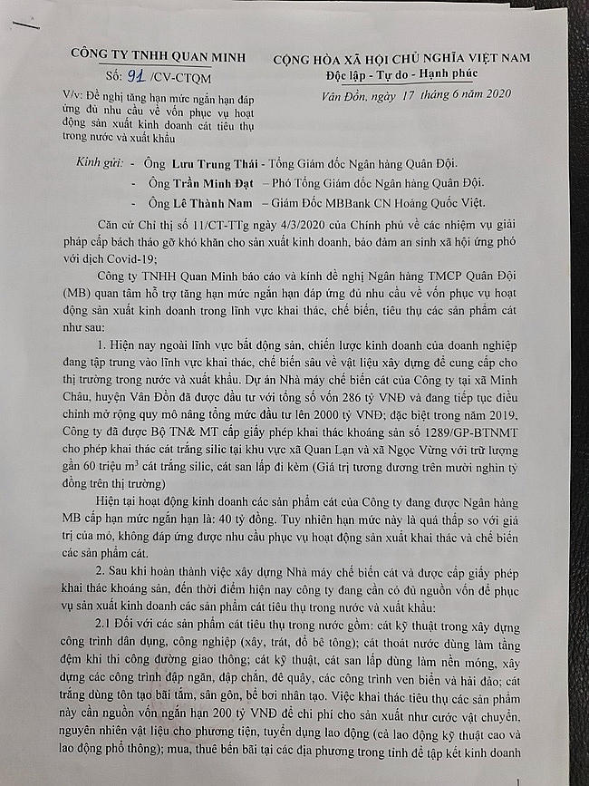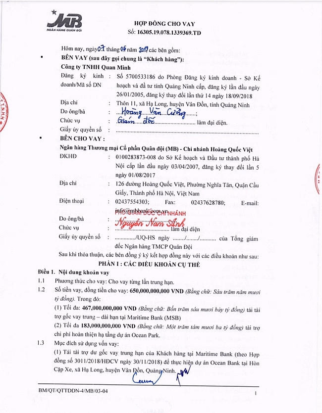 Tuy nhiên, MB Bank lại bất ngờ chuyển toàn bộ dư nợ của Công ty Quan Minh từ nhóm nợ 1 sang nhóm 4 (nhóm nợ xấu nghi ngờ mất vốn). Cùng với đó, suốt một thời gian dài từ tháng 12/2019, MB Bank đã không tiếp tục giải ngân nguồn vốn trung – dài hạn theo cam kết ban đầu để chủ đầu tư tiếp tục thi công Dự án Ocean Park Vân Đồn.