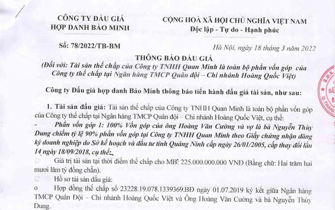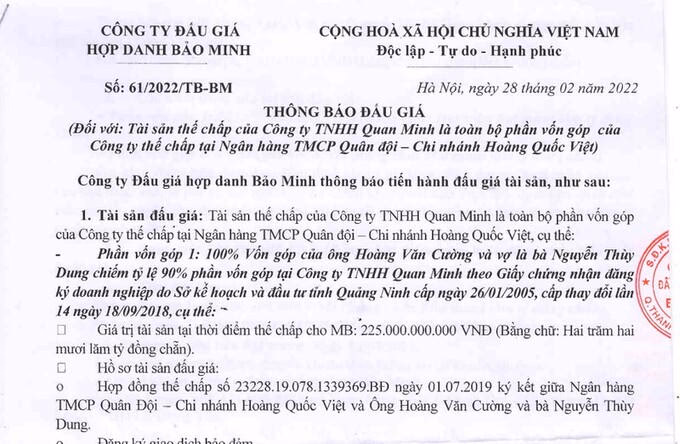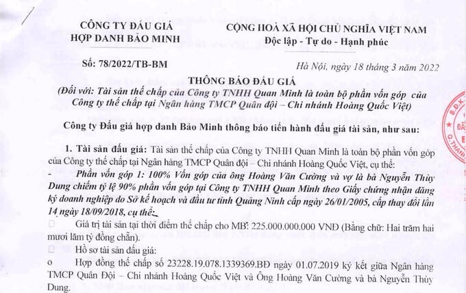 Một diễn biến khác, đó là tài sản thế chấp của công ty Quan Minh được MB Bank mang đi đấu giá bao gồm: toàn bộ vốn góp của ông Hoàng Văn Cường, Chủ tịch Công ty Quan Minh, cùng vợ là bà Nguyễn Thùy Dung (chiếm 90% vốn điều lệ Công ty Quan Minh), giá trị tài sản tại thời điểm thế chấp là 225 tỷ đồng. Và 100% vốn góp của ông Hoàng Bá Dũng tại Quan Minh (tương đương 10% vốn công ty) tương đương giá trị 25 tỷ đồng cũng được dùng làm tài sản thế chấp ngân hàng. Giá khởi điểm đúng bằng giá tài sản tại thời điểm thế chấp cho MB Bank.