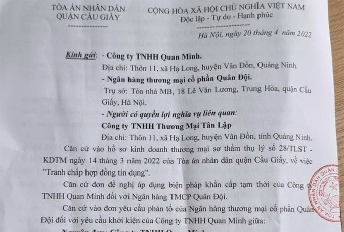 Mới đây nhất, ngày 20/4/2022, Tòa án nhân dân quận Cầu Giấy đã ra văn bản yêu cầu MB Bank không thực hiện việc bán đấu giá tài sản khi chưa có bản án có hiệu lực pháp luật giải quyết đối với các yêu cầu khởi kiện của nguyên đơn cũng như phản tố của bị đơn.
