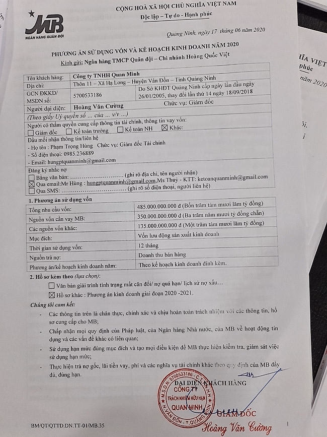Tuy nhiên, trước sự mời gọi hợp tác của đại diện Ngân hàng TMCP Quân đội – Chi nhánh Hoàng Quốc Việt (Cầu Giấy, TP.Hà Nội), Công ty Quan Minh đã đồng ý hợp tác, hai bên thống nhất MB Bank sẽ thực hiện tái tài trợ nợ gốc vay tại Ngân hàng Maritime Bank và nâng hạn mức tín dụng giải ngân.