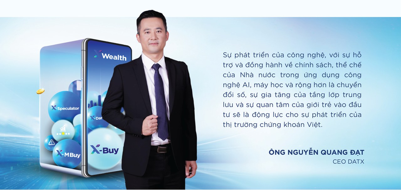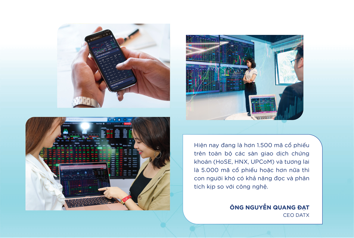 Một yếu tố quan trọng là các dữ liệu được thu thập, phân tích, xử lý, đánh giá… theo thời gian thực, và hành động đầu tư cũng được đưa ra theo thời gian thực của thị trường. Phần lõi công nghệ của DATX như một viên kim cương thô, và chúng tôi đang nỗ lực từng bước giới thiệu những vẻ đẹp lấp lánh của nó tới nhà đầu tư với các sản phẩm đã và sắp ra mắt. Công nghệ AI sẽ tiếp tục phát triển hoặc các công nghệ mới như blockchain (chuỗi, khối), giúp cho việc vận hành thị trường mang tính đơn giản, minh bạch hơn, với khả năng đáp ứng nhu cầu ngày càng cao của thị trường.