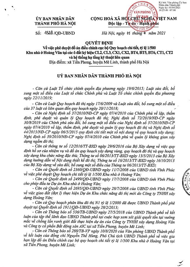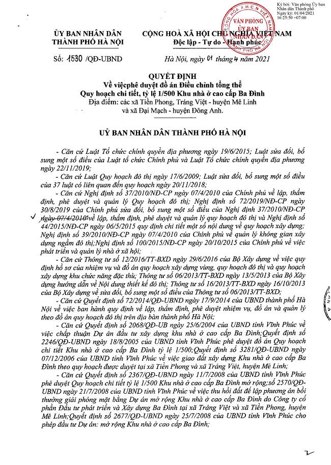 Cụ thể, hai dự án được điều chỉnh quy hoạch là khu nhà ở cao cấp Ba Đình (xã Tiền Phong, Tráng Việt, huyện Mê Linh và xã Đại Mạch, huyện Đông Anh) và dự án khu nhà ở Hoàng Vân (xã Tiền Phong, huyện Mê Linh).