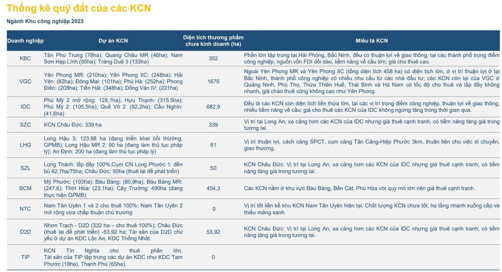 Đặc biệt là các KCN trong các tỉnh thành được phân bổ vốn lớn, các dự án trọng điểm như Châu Đức, Phú Mỹ 2 (gần cao tốc Biên Hòa-Vũng Tàu), Hựu Thạnh, Nam Tân Uyên, Tân Phú Trung (gần Vành đai 3 TP HCM); các KCN tại Bắc Ninh (đường vành đai 4 Hà Nội); các KCN tại Hải Phòng (cao tốc Hà Nội – Hà Nội đã hoàn thành),…