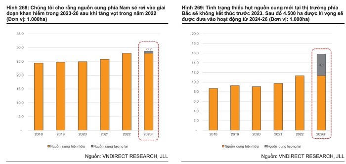 Trái lại, nguồn cung nhà kho và nhà xưởng xây sẵn được dự báo dồi dào trong giai đoạn 2023-2026, đặc biệt là khu vực phía Nam. “Chúng tôi nhận thấy nguồn cung lớn nhà kho và nhà xưởng xây sẵn sẽ được đưa vào hoạt động trong vòng 4 năm tới ở cả phía Bắc và Nam”, VNDirect nhận định.