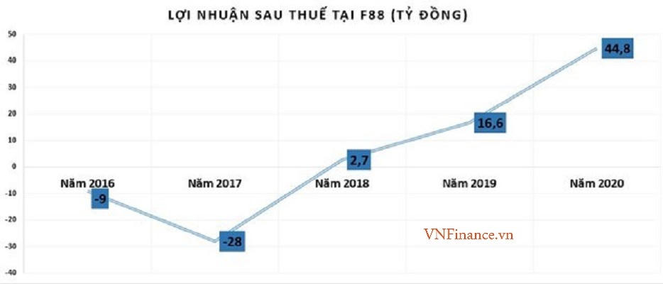 Năm 2020, F88 đặt mục tiêu lãi sau thuế đạt 377 tỷ đồng, tuy nhiên kết thúc năm 2020 doanh nghiệp này chỉ đạt được 44,8 tỷ đồng, mới chỉ hoàn thành được 12% kế hoạch cả năm.