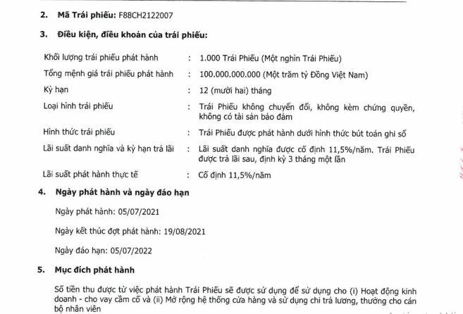 Như vậy, từ đầu năm đến nay, đã 7 lần F88 huy động vốn qua kênh trái phiếu. Tổng giá trị phát hành đã đạt 800 tỷ đồng. Đáng chú ý, một số đợt phát hành có lãi suất cố định lên đến 12,5% một năm và hầu hết không có tài sản bảo đảm.
