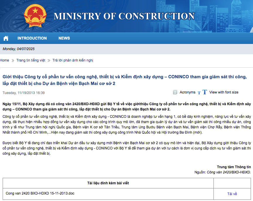 Theo tìm hiểu của VietnamFinance, ngày 15/11/2013 Bộ Xây dựng có công văn 2420/BXD-HĐXD gửi Bộ Y tế về việc giới thiệu Công ty cổ phần Tư vấn công nghệ, thiết bị và kiểm định xây dựng – CONINCO, tham gia giám sát thi công, lắp đặt thiết bị cho Dự án Bệnh viện Bạch Mai cơ sở 2.