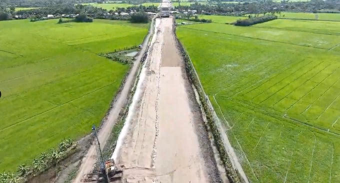 Thời điểm hiện tại, vùng Đồng bằng sông Cửu Long đang bước vào mùa mưa, do đó tận dụng những ngày nắng, lực lượng thi công đang tập trung nhân lực và máy móc tiến hành thi công lu nền, gia tải.