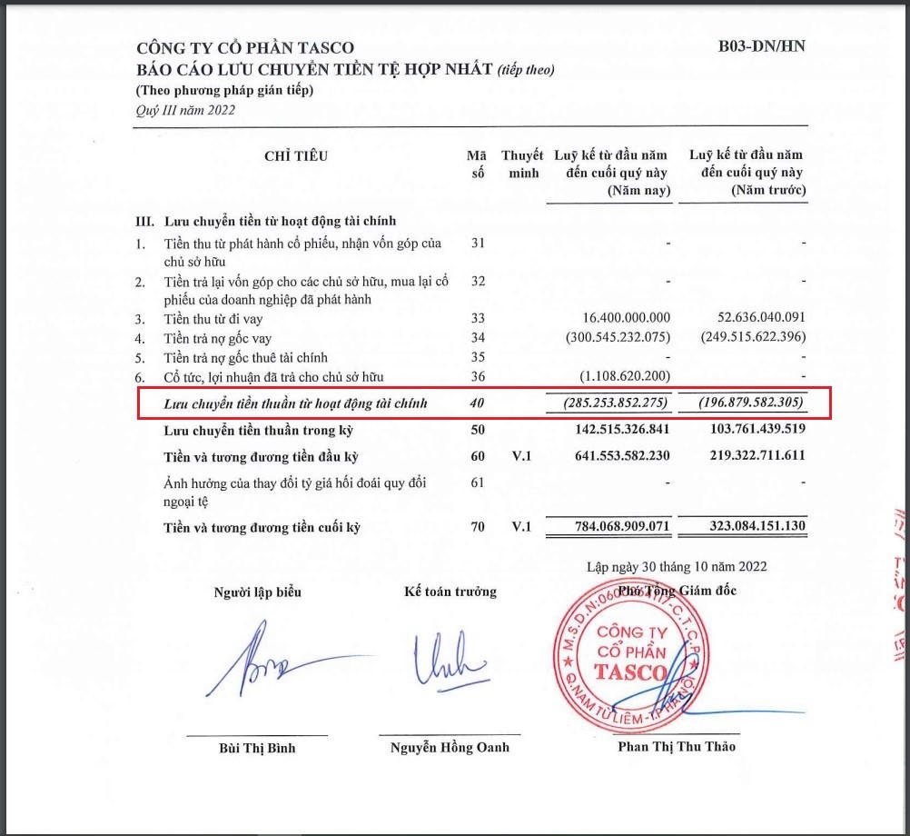 Trong khi đó dòng tiền từ hoạt động đầu tư của Tasco lại âm 229 tỷ đồng, trong khi cùng kỳ dương 8,6 tỷ đồng.