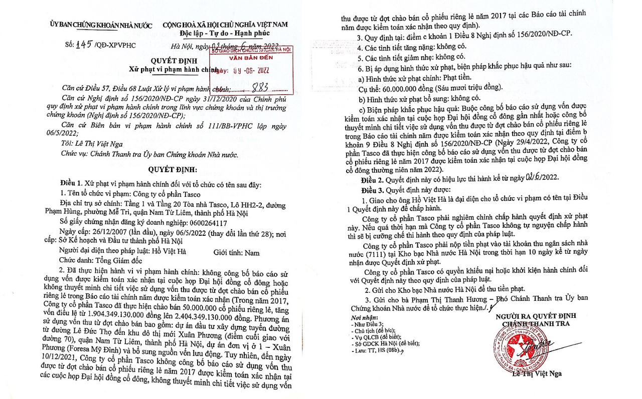 Để khắc phục hậu quả, UBCKNN yêu cầu Tasco công bố báo cáo sử dụng nguồn vốn được kiểm toán xác nhận tại cuộc họp Đại hội đồng cổ đông gần nhất hoặc tại BCTC năm được kiểm toán theo quy định.