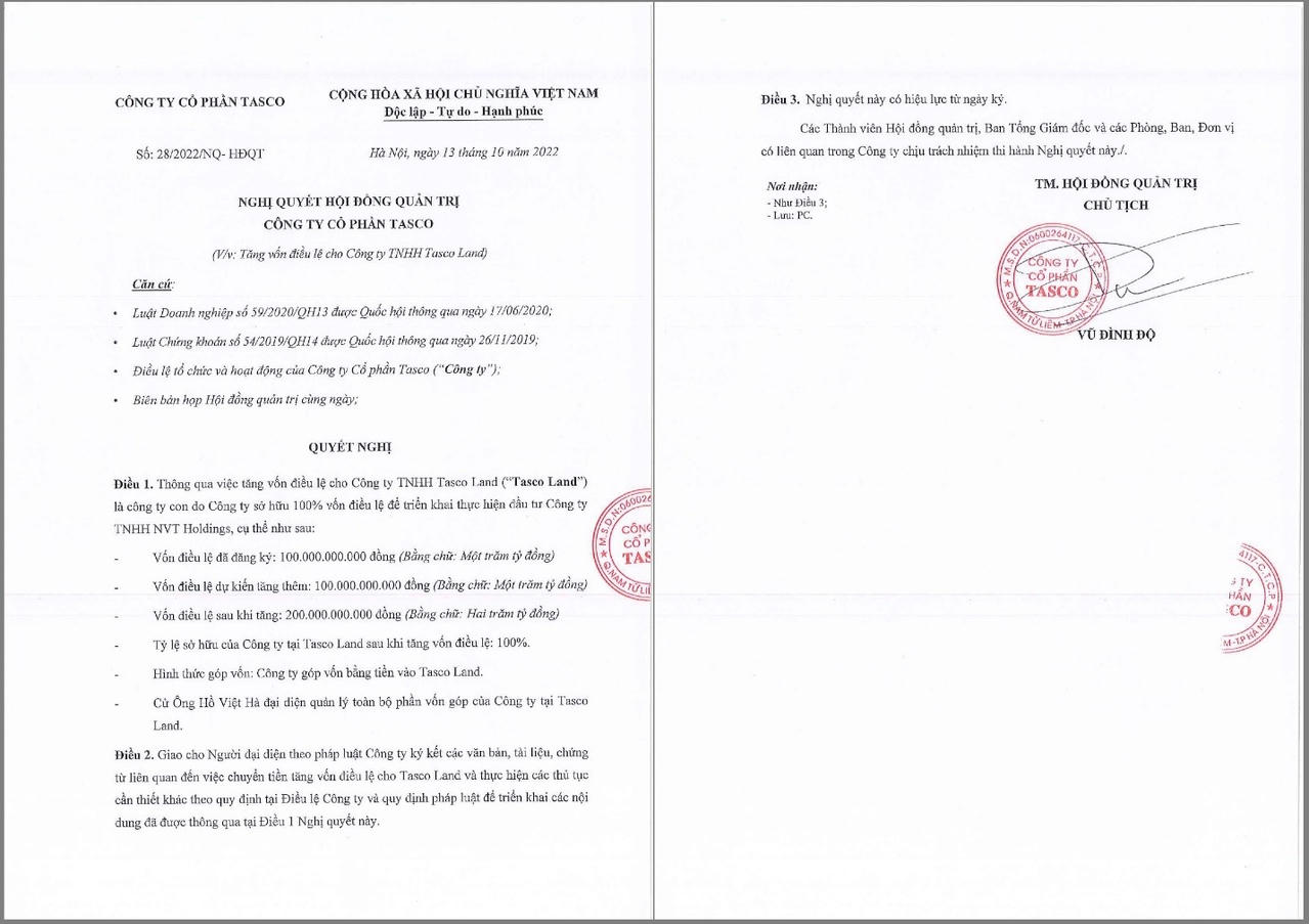 Ở một diễn biến mới đây, Tasco tiếp tục thông qua nghị quyết tăng vốn điều lệ cho Công ty TNHH Tasco Land để triển khai thực hiện đầu tư Công ty TNHH NVT Holdings.