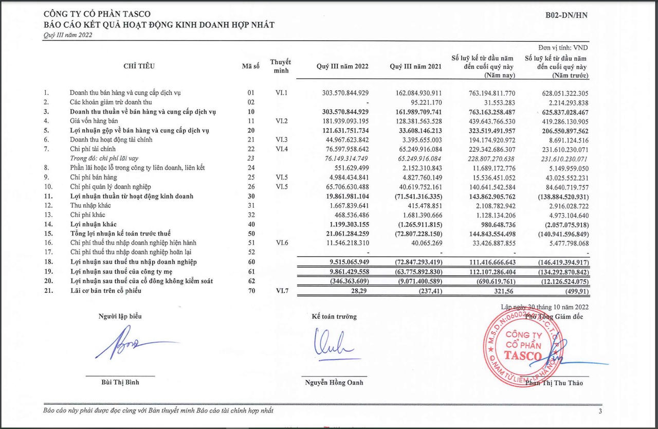 Theo bố báo cáo tài chính hợp nhất quý III/2022 của Tasco, trong kỳ, doanh nghiệp ghi nhận khoản doanh thu thuần đạt 303,5 tỷ đồng (tăng 142 tỷ đồng so với cùng kỳ).