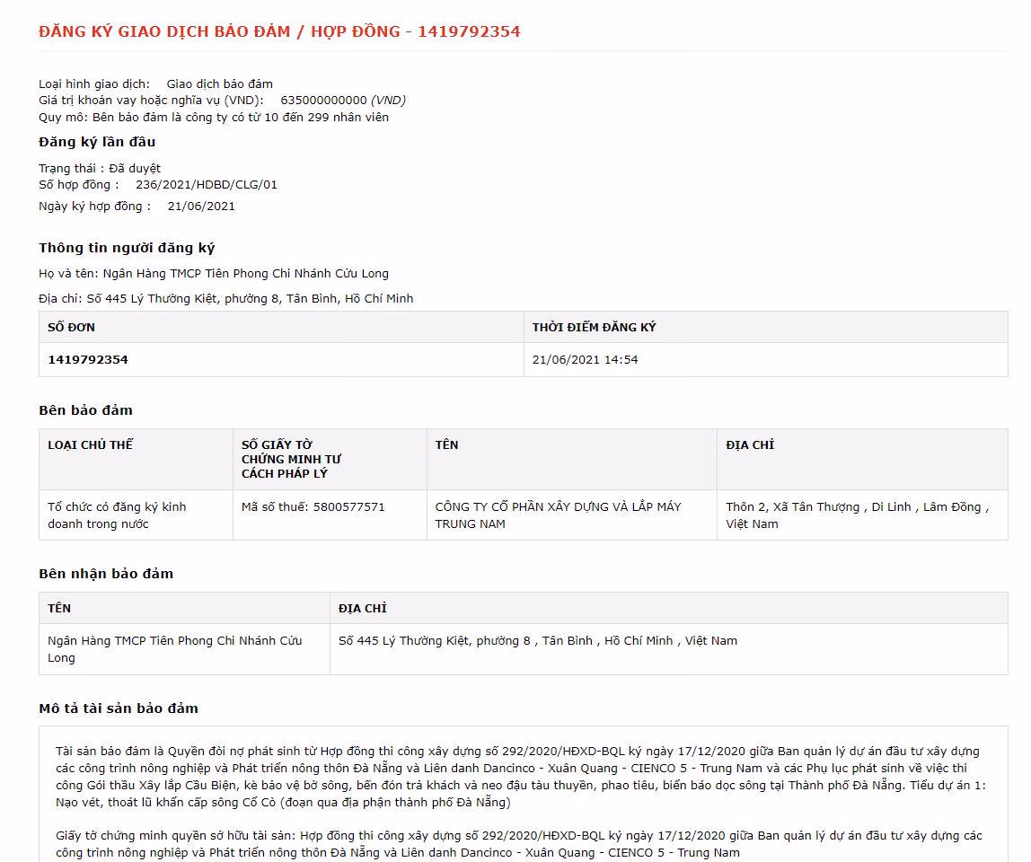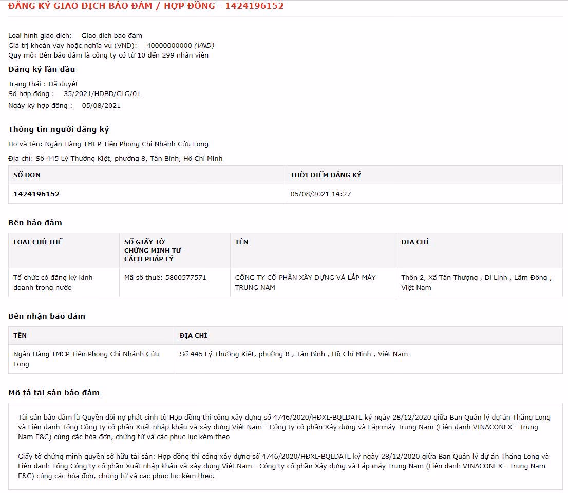 Tháng 8/2021, doanh nghiệp tiếp tục thế chấp quyền đòi nợ phát sinh từ Hợp đồng thi công xây dựng số 4746/2020/HĐXL-BQLDATL ký ngày 28/12/2020 giữa Ban Quản lý dự án Thăng Long và Liên danh Tổng Công ty cổ phần Xuất nhập khẩu và xây dựng Việt Nam - Công ty cổ phần Xây dựng và Lắp máy Trung Nam (Liên danh VINACONEX - Trung Nam E&C). Ngân Hàng TMCP Tiên Phong Chi Nhánh Cửu Long tiếp tục là bên nhận thế chấp.