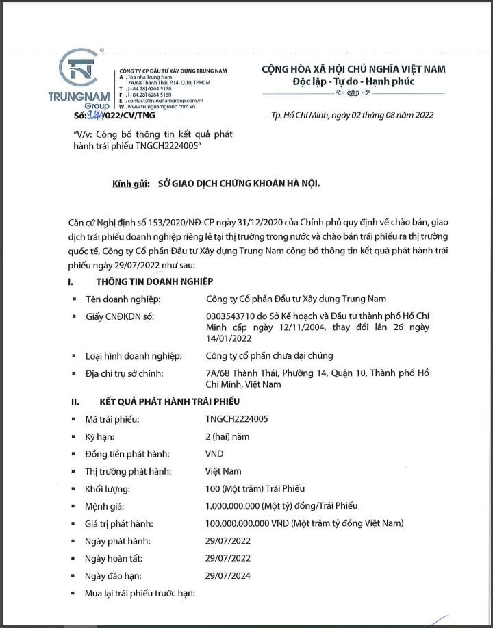 Cụ thể, theo thông tin từ Sở giao dịch Chứng khoán Hà Nội (HNX), lô trái phiếu của CTCP Đầu tư Xây dựng Trung Nam có mã TNGCH2224005, được phát hành vào ngày 29/7/2022 và được hoàn tất vào cùng ngày. Lô trái phiếu được phát hành với mệnh giá 1.000.000.000 đồng/trái phiếu, đáo hạn vào ngày 29/7/2024.