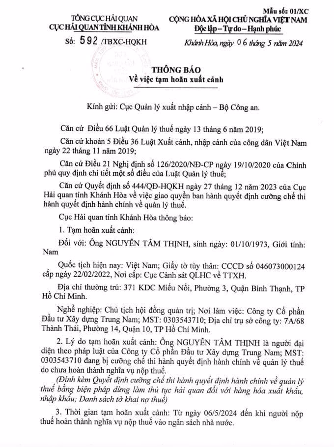 Theo đó, từ ngày 6/5, Cục Hải quan Khánh Hòa đề nghị Cục Quản lý xuất nhập cảnh – Bộ Công an hoãn xuất cảnh đối với ông Nguyễn Tâm Thịnh (sinh năm 1973, ngụ TP. HCM) là người đại diện theo pháp luật của Trung Nam Group.