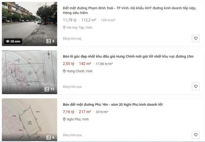 Cùng với nhiều dự án khu đô thị, khu nhà ở được xây dựng, đất nền của thành phố Vinh cũng ghi nhận mức giá gia tăng thời gian gần đây. Theo Batdongsan.com.vn, giá đất nền tại khu vực thành phố Vinh ghi nhận ở mức khá cao từ 10-35 triệu đồng/m2, thậm chí khu vực đất mặt đường còn ghi nhận ở mức 105 triệu đồng/m2.