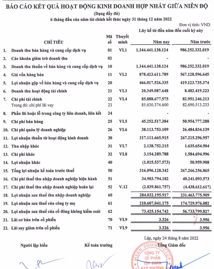 6 tháng đầu năm 2022, Đạt Phương ghi nhận doanh thu đạt 1.344,4 tỷ đồng, tăng 36,3% so với cùng kỳ và lợi nhuận sau thuế đạt 284,03 tỷ đồng, tăng 22,7% so với cùng kỳ năm trước.