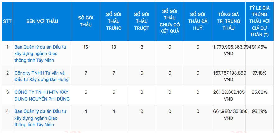 VietnamFinance sẽ phân tích cụ thể những gói thầu mà đơn vị đã trúng tại Ban QLDA Đầu tư xây dựng ngành giao thông tỉnh Tây Ninh và Công ty TNHH Tư vấn và Đầu tư xây dựng Đại Hưng ở bài sau.