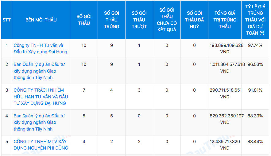 Cùng với đó, nhà thầu này cũng trúng nhiều gói thầu khác tại tỉnh Tây Ninh do Công ty TNHH Tư vấn và Đầu tư xây dựng Đại Hưng làm bên mời thầu, khi trúng tới 7 gói thầu với tổng giá trị 167 tỷ đồng.