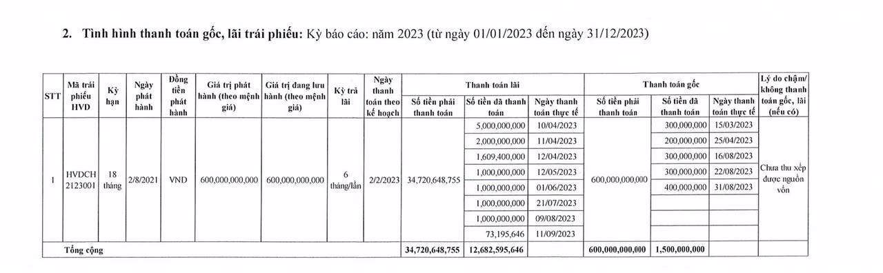 Theo công bố mới nhất của Hưng Vượng Developer tại Chuyên trang thông tin trái phiếu doanh nghiệp (Cbonds), năm 2023, doanh nghiệp này mới thanh toán được 12,6 tỷ đồng tiền lãi và 1,5 tỷ đồng tiền gốc của lô trái phiếu nêu trên. Lý do chậm trễ được đưa ra là chưa thu xếp được nguồn vốn.