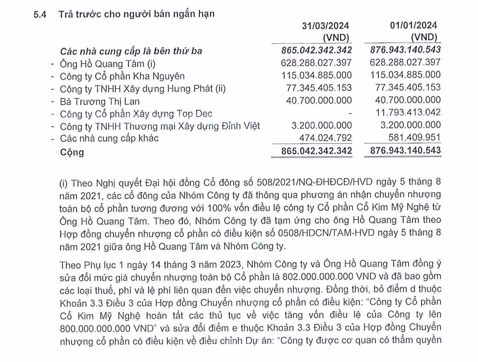 Mặt khác, sau khi hợp nhất báo cáo tài chính với Hưng Vượng Developer, báo cáo tài chính của In Hoà Phát ghi nhận nhiều khoản phải thu, phải trả với số liệu rất lớn liên quan đến doanh nghiệp này. Trong đó tiêu biểu nhất phải kể đến khoản phải trả lên tới 628 tỷ đồng (ghi nhận ngày 31/3/2024) đối với ông Hồ Quang Tâm. Đây là khoản phải trả liên quan đến số tiền mà Hưng Vượng Developer bỏ ra để mua 100% cổ phần Kim Mỹ Nghệ. Cần biết, lượng cổ phần này sau đó đã được đem thế chấp để phát hành lô trái phiếu 600 tỷ đồng.