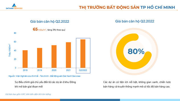 Tại TP HCM, giá bán căn hộ trong quý II ghi nhận ở mức 65 triệu đồng mỗi m2, tăng 3% theo quý. Sự điều chỉnh giá chủ yếu đến từ các dự án ở khu Đông khi mở bán giai đoạn mới. Các dự án có tiện ích nổi bật, không gian xanh, chiến lược bán hàng và truyền thông mạnh mẽ vẫn có tốc độ bán hàng cao.