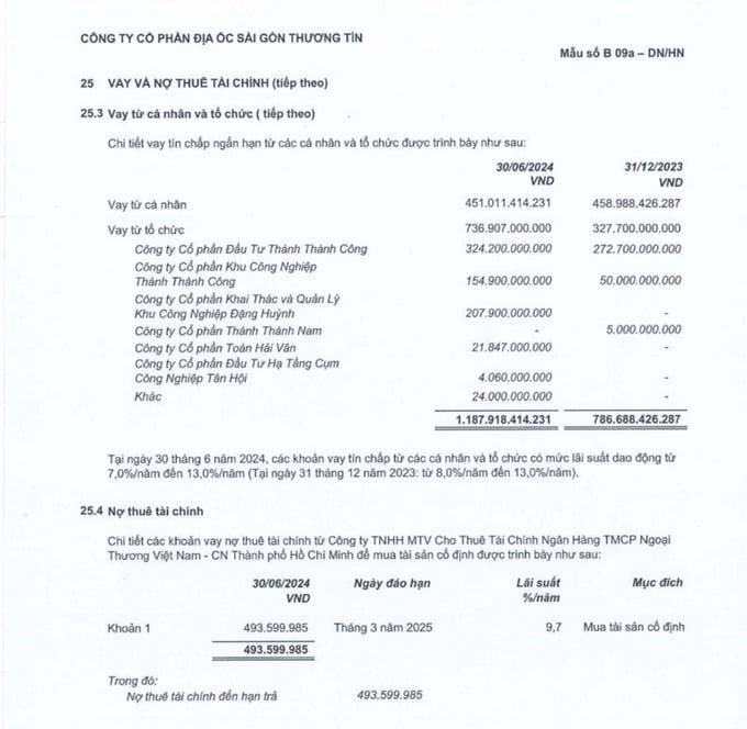 Ngoài ra, TTC Land còn vay tín chấp ngắn hạn từ các tổ chức và cá nhân như: Công ty Cổ phần Đầu tư Thành Thành Công; Công ty Cổ phần Khu Công nghiệp Thành Thành Công; Công ty Cổ phần Khai thác và Quản lý Khu Công nghiệp Đặng Huỳnh; Công ty Cổ phần Thành Thành Nam; Công ty Cổ phần Toàn Hải Vân; Công ty Cổ phần Đầu tư cụm Công nghiệp Tân Hội, với tổng số tiền hơn 1.187 tỷ đồng với mức lãi suất dao động từ 7,0% - 13,0%/năm.