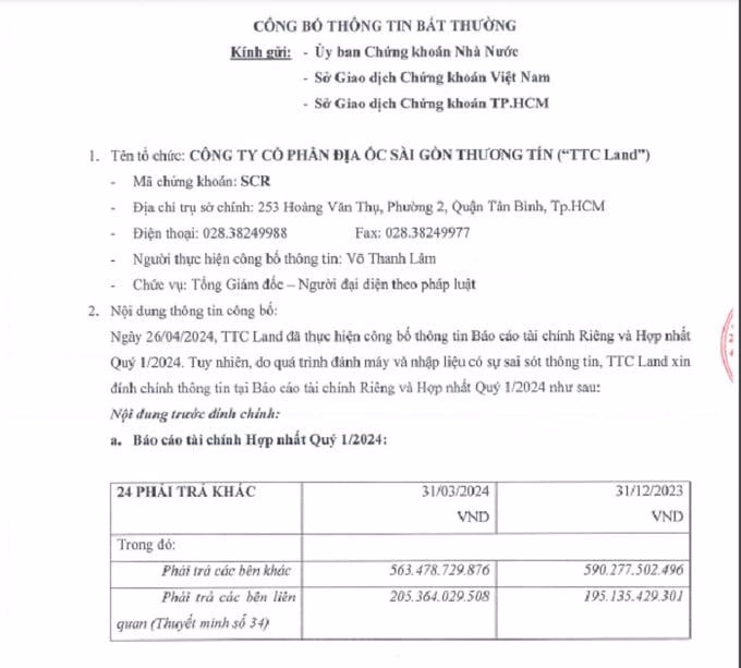 Đến ngày 14/6/2024, TTC Land công bố thông tin bất thường đính chính Báo cáo tài chính riêng và hợp nhất quý I/2024, với lý do quá trình đánh máy và nhập liệu có sự sai sót thông tin. Trong đó, TTC Land điều chỉnh lại khoản Phải trả khác giảm từ 563 tỷ xuống 547 tỷ đồng, Phải trả các bên liên quan (chủ yếu các doanh nghiệp trong hệ sinh thái TTC Group) từ 205 tỷ lên 222 tỷ đồng.