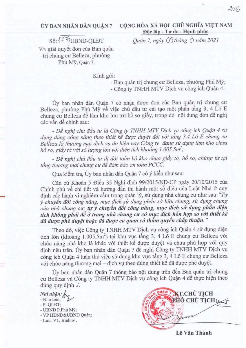 Do vậy, UBND quận 7 đề nghị Công ty TNHH MTV Dịch vụ công ích quận 4 tuân thủ việc sử dụng tầng 3, 4 lô E chung cư Belleza với chức năng thương mại – dịch vụ theo đúng thiết kế đã được duyệt.