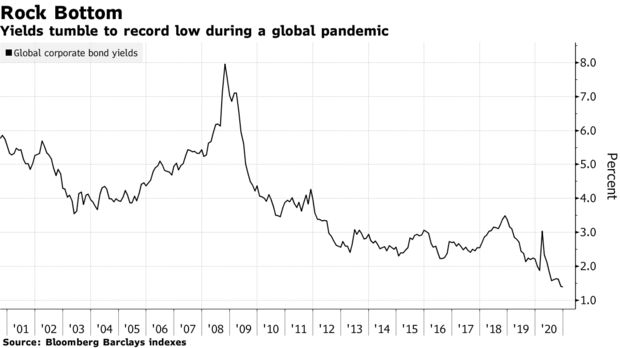 Trong một môi trường với trái phiếu lợi suất âm trị giá 18 nghìn tỷ USD, nhà đầu tư buộc phải mua trái phiếu doanh nghiệp rủi ro với mức định giá kỷ lục. Tại Mỹ, lợi suất trái phiếu rác đã giảm xuống mức thấp hơn nhiều so với mức lãi suất mà các nhà phát hành có điểm tín nhiệm cao phải trả để huy động vốn trái phiếu trong năm nay.
