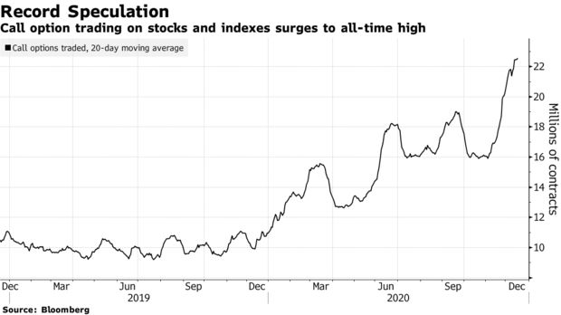 Các nhà đầu tư nhỏ lẻ đặt cược vào thị trường giá tăng đã rơi vào “ma trận” phái sinh phức tạp nhất lịch sử. Chỉ trong vòng 20 ngày qua, một lượng quyền chọn mua kỷ lục được giao dịch tại các sàn chứng khoán Mỹ với khối lượng xấp xỉ 22 triệu quyền chọn/ ngày.