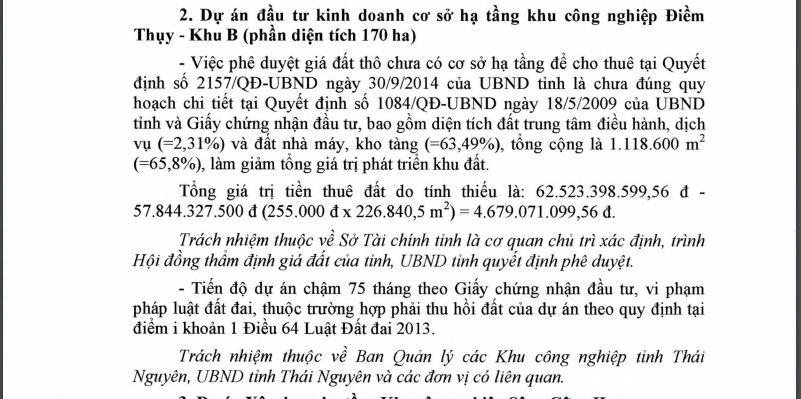 Tại Dự án đầu tư kinh doanh cơ sở hạ tầng khu công nghiệp Điềm Thụy - Khu B (phần diện tích 170 ha), TTCP cũng nêu rõ việc phê duyệt giá đất thô chưa có cơ sở hạ tầng để cho thuê tại Quyết định số 2157 QĐ-UBND ngày 30/9/2014 của UBND tỉnh Thái Nguyên là chưa đúng quy hoạch chỉ tiết tại Quyết định số 1084/QĐ-UBND ngày 18/5/2009 của UBND tỉnh và Giấy chứng nhận đầu tư.
