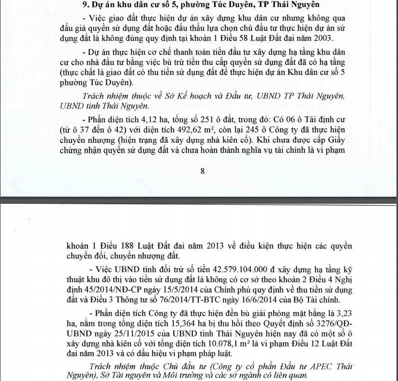 Thanh tra Chính phủ đã nêu hai dự án tại Thái Nguyên do Công ty CP Đầu tư APEC Thái Nguyên làm chủ đầu tư gồm dự án khu dân cư số 5 (phường Túc Duyên, TP.Thái Nguyên) và KCN Điềm Thuỵ đã có nhiều sai phạm nghiêm trọng.