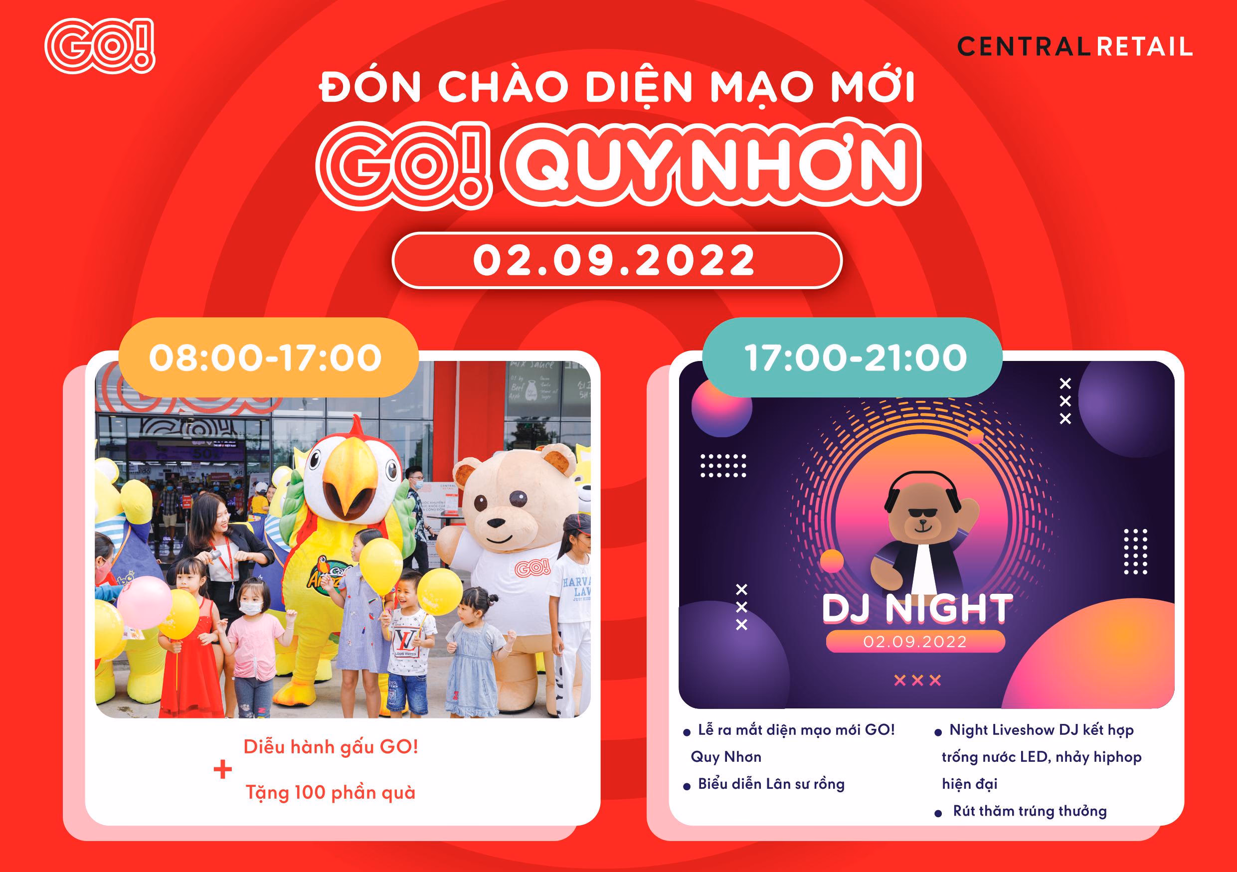 Nhân dịp đi vào hoạt động chính thức với diện mạo mới, GO! Quy Nhơn sẽ tổ chức nhiều sự kiện và chương trình hấp dẫn từ ngày 2 đến ngày 4/9 năm 2022. Diễu hành gấu GO! Teddy sẽ mở màn ngày khai trương GO! Quy Nhơn vào sáng ngày 2/9. Những khách hàng may mắn sẽ có cơ hội nhận được 100 phần quà gấu GO! Teddy. Phần tiếp theo là lễ ra mắt diện mạo mới TTTM GO! Quy Nhơn với chương trình biểu diễn nghệ thuật lân sư rồng. Trong khuôn khổ của lễ khai trương, nhiều hoạt động sôi nổi khác cũng sẽ được diễn ra như night liveshow DJ kết hợp trống nước LED, nhảy hiphop hiện đại và rút thăm trúng thưởng với nhiều phần quà giá trị.