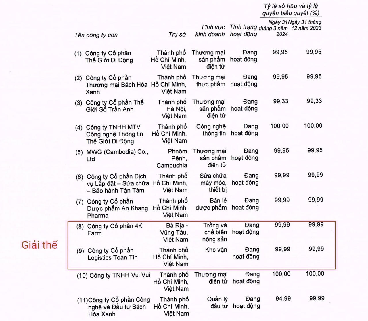 Ngày 8/5, Công ty CP Đầu tư Thế Giới Di Động (HoSE: MWG) đã thông qua quyết định giải thể hai công ty con là Công ty CP Logistics Toàn Tín và Công ty CP 4KFarm. Lý do được đưa ra là để tái cơ cấu lại nhóm các công ty con nhằm tối ưu việc vận hành.