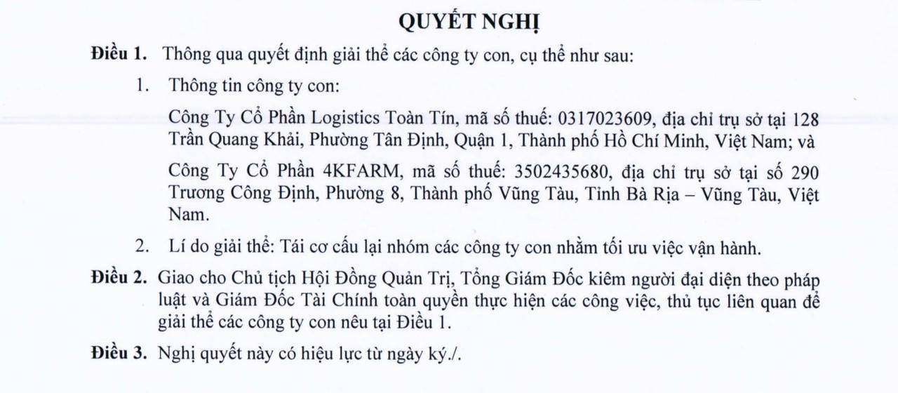 Việc giải thể Logistics Toàn Tín và Công ty CP 4KFarm được xem là hành động đầu tiên trong năm 2024 cụ thể hoá kế hoạch tái cấu trúc toàn diện được Chủ tịch Nguyễn Đức Tài nhấn mạnh tại ĐHĐCĐ thường niên diễn ra tháng trước.