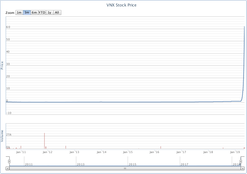 Cổ phiếu VNX đã tăng trần 18 phiên liên tiếp rồi tham chiếu duy nhất một phiên ngày 18/4 và lại tiếp tục trần 13 phiên cho tới nay. Tuy nhiên khối lượng khớp lệnh hàng phiên của VNX lại rất thấp, chỉ loanh quanh 100 đơn vị/phiên, có một phiên đạt 300 đơn vị và chỉ ba phiên gần đây khối lượng giao dịch của VNX mới cải thiện lên mức trên 2.200. Qua đó, có thể thấy giao dịch bất thường của cổ phiếu VNX.