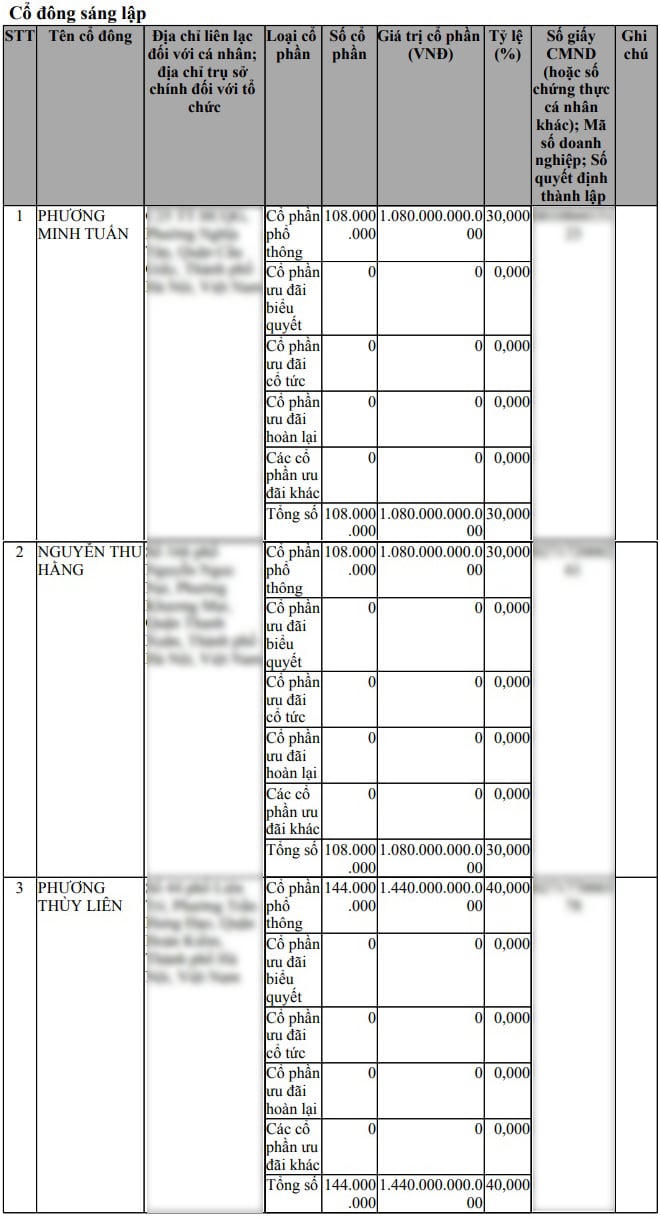 Về Công ty TNHH Đầu tư VNC, doanh nghiệp này được thành lập vào tháng 5/2013, với số vốn điều lệ ban đầu là 100 tỷ đồng. Trong đó, Hoàng Thị Dưỡng góp 2 tỷ đồng, sở hữu 2% cổ phần và Hoàng Phú Bằng góp 98 tỷ đồng, sở hữu 98% cổ phần.