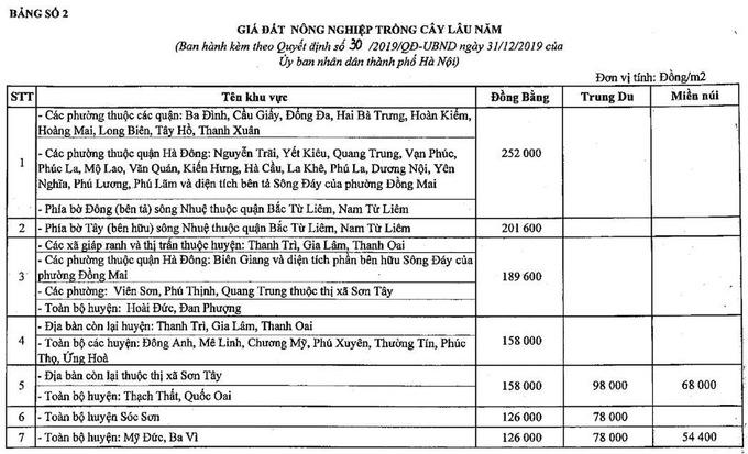 Bảng 2: Giá đất nông nghiệp trồng cây lâu năm