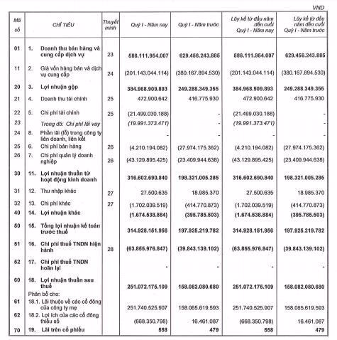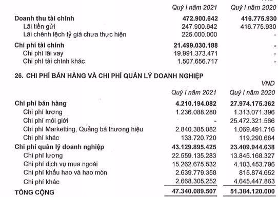 Theo đó, trong quý 1 vừa qua công ty ghi nhận khoản chi phí tài chính 21,5 tỷ đồng, trong đó riêng chi phí lãi vay 20 tỷ đồng, trong khi cùng kỳ ghi nhận chi phí tài chính bằng 0. Chi phí bán hàng hơn 4,2 tỷ đồng, giảm 23,7 tỷ đồng so với cùng kỳ chủ yếu do quý 1 năm ngoái Phát Đạt ghi nhận hơn 25,4 tỷ đồng vào chi phí môi giới.